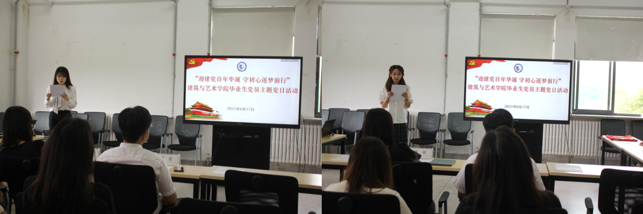 在中国共产党即将迎来建党100周年之际,在2021届毕业生即将离开母校之时,6月17日上午,建筑与艺术学院党委于建馆510教室开展“迎建党百年华诞 守初心逐梦前行”毕业生党员最后一次主题党日活动。学院党委书记常亮,党委副书记兼副院长、纪委书记张硕参加了此次党日活动,活动由学院研究生辅导员王加冕主持。