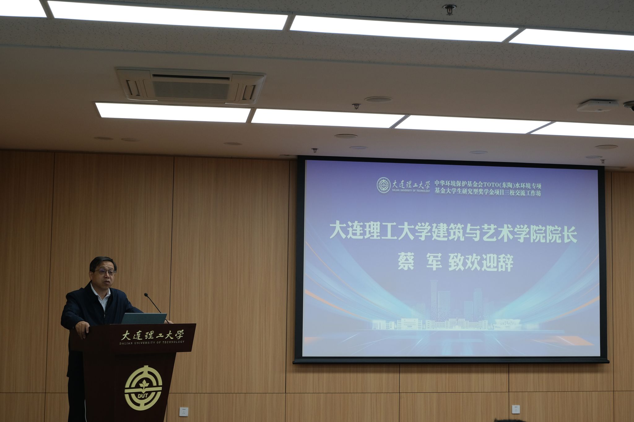 建筑与艺术学院院长蔡军教授向各位来宾致欢迎辞。他对中华环境保护基金会和东陶中国有限公司对学院人才培养工作的关注与支持表示感谢。他勉励同学们瞄准国家战略需求,学精专业知识,提升科创能力,锐意进取、报效国家。
