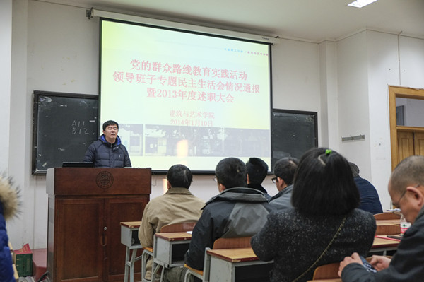 1月10日下午,学院党的群众路线教育实践活动领导班子专题民主生活会情况通报会暨2013年度述职大会在建馆114举行。学校党的群众路线教育实践活动督导组成员张亮老师、学校党委组织部李晓杰老师、学院全体教职工参加了会议。