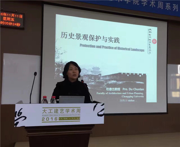 2016年11月11日上午,我院有幸邀请到重庆大学建筑城规学院院长杜春兰教授,为大工师生做了一场精彩的《历史性景观环境的保护与实践》主题讲座。杜春兰教授,重庆大学建筑城规学院院长,教授,博士生导师,重庆大学风景园林学科的学术带头人。长期致力于景观规划与设计、风景园林资源保护与生态修复、城市设计与旅游规划、园林历史与当代景观理论研究。