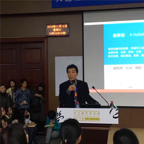 本次讲座的主题为“回到建筑的全体论“,庄惟敏教授讲到,要知道全体论是思想与操作的连贯,学理与工法的融汇,知识与技能的共轭,自然科学、哲学、神学、美术、音乐、手工艺的精通。尽管专业分工的加剧使得“全才”不再可能存在,但打破学科分野,桥接理论与实践领域的全体论方法仍然是可行的。在全体论下的创作态度使我们懂得,建筑师的职业是十分复杂的,建筑创作就是合理,贴切而创意地将空间进行组合、重复、变化和重构的劳动,城市可视为简单结构的无限的重复,人们通过对这些最小单元的重构来构建城市,所以建筑师应该从小处着眼。建筑师的设计是心灵、技能、建造的三合一,如果说建筑是凝固的音乐,那么建筑设计就是一部多意志的交响曲。在当今文化多元化背景下的建筑创作是有理由快乐的,因为只要你用心,建筑总会给你带来惊喜。