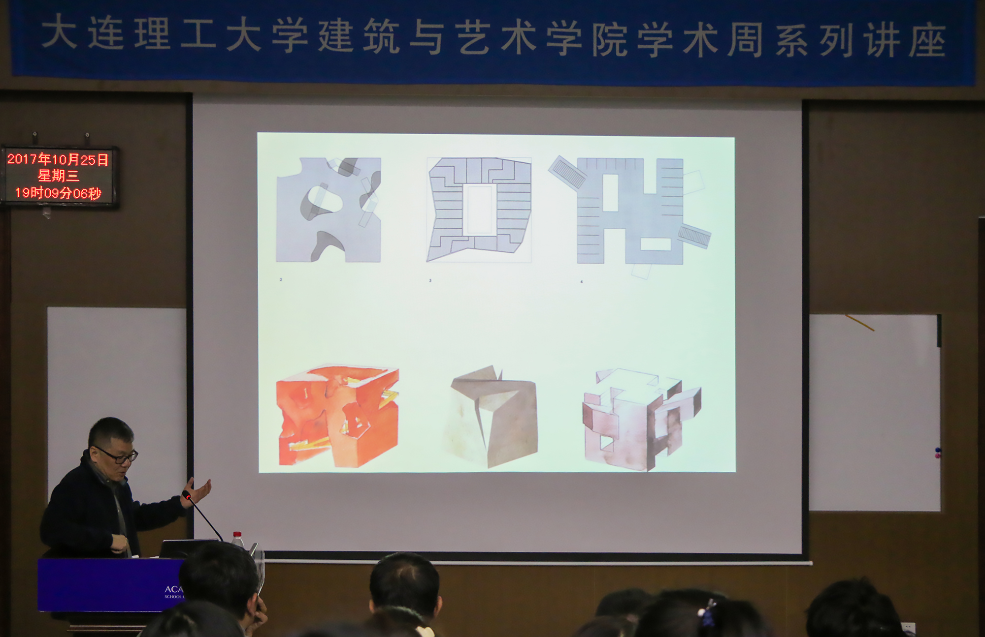 讲座以探索建筑学起源于美院开始,说明了绘画训练与建筑设计的密切关系。巴黎美院注重画的形象准确,顾大庆教授以杨廷宝为例,其如画般的设计作品体现了受到前期美术训练的影响;路易斯康画作注重体验几何结构,排斥光影素描;柯布注重分层次的空间体验,运用共享边界和模棱两可的图底关系;斯蒂文霍尔则是将绘画与设计结合起来以探索灵感,均将绘画所得运用到了建筑设计当中。顾教授认为,现代美学学习不应只追求形似,更应注重色彩解析、描述体验、想象表现。
