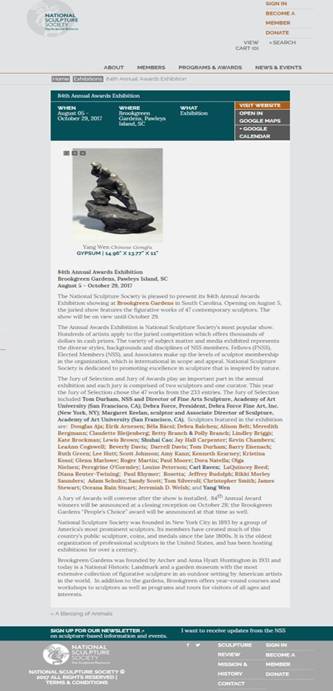 美国国家雕塑学会2017年举办的第84届美国国际雕塑艺术展,评委会通过来自全世界233名雕塑家提交的986幅作品进行严格筛选,最后确定了47件入选作品。展览于8月5日至10月29日在美国南卡罗来纳州的布鲁克林公园展出。协会成立124年来首次迎来中国艺术家以表现中国文化与艺术精神的雕塑作品,温洋老师的作品对于中国精神与艺术思想的表现获得了评委会的肯定和赞赏,应邀赴美展览并交流。
