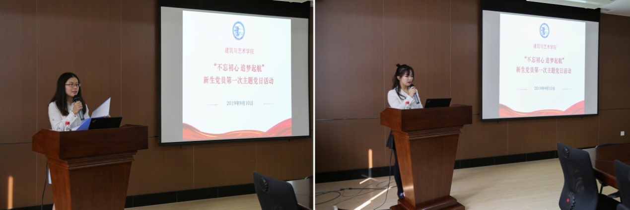 2018级研究生党员代表牛路菁、张帆发言,针对如何成为一名合格的研究生党员和如何在研究生群体中起到模范带头作用分享了个人的经验和想法。研究生党员是研究生和党员两种身份的结合,是理想和行动的结合,是学习、工作、生活的结合,希望新生党员可以努力学习,不断提高自身素质,自觉遵守组织生活相关规定,加强党性修养,坚定理想信念。