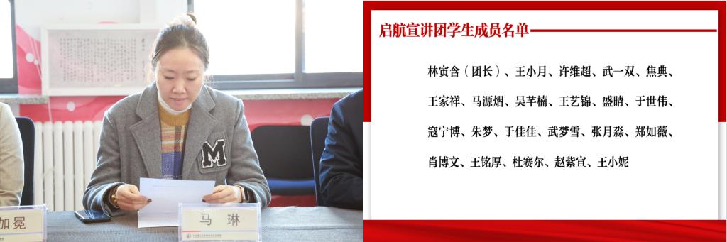 建筑与艺术学院党委组织员马琳介绍“启航”宣讲团成员组成。作为师生宣讲团,由学院领导班子、党委委员、学生辅导员、志愿从事理论宣讲的教师;博士研究生、硕士研究、本科生的学生共同组成。同时马琳老师在会上宣布了首批成为“启航”宣讲团成员的22名学生,并寄语各位宣讲团成员,坚定理想信念,牢记初心使命,以青年之声发时代强音;练就过硬本领,投身社会实践,以青年之行传时代精神;矢志艰苦奋斗,锤炼高尚品格,以青年之志承时代使命。