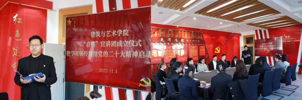 为深入学习宣传贯彻党的二十大精神,深入推动习近平新时代中国特色社会主义思想和党的二十大精神入脑入心,推动兴起学习宣传贯彻党的理论学习热潮,推动学院“四学四亮”制度进一步走深走实,2022年11月4日,建筑与艺术学院党委隆重举行建筑与艺术学院“启航”宣讲团成立仪式暨学习宣传贯彻党的二十大精神启动仪式。建筑与艺术学院党委书记常亮,党委副书记兼副院长、纪委书记张硕,党委组织员马琳,学院各党支部党员代表及“启航”宣讲团成员共同参加了本次启动仪式。仪式由研究生辅导员王加冕主持。