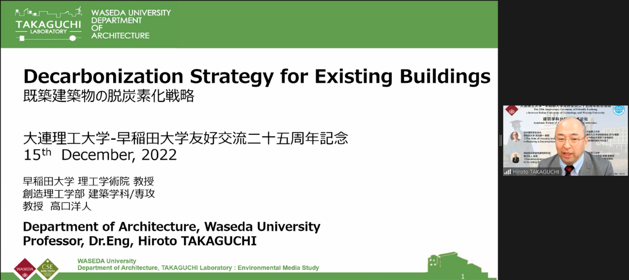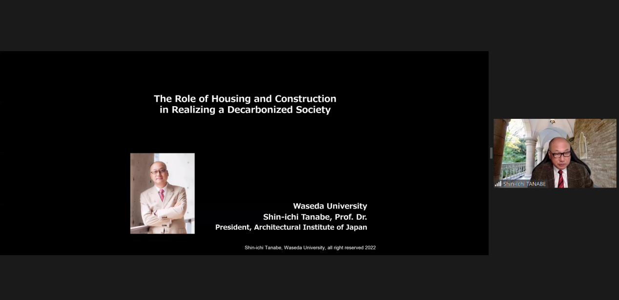 会议的第二个阶段为学术论坛。首先,由日本建筑学会会长、日本科学委员会委员、早稻田大学田边新一教授进行主题为《脱炭素社会実現への住宅・建築の役割》的报告。在日本到 2050 年实现碳中和的目标,住房和建筑的碳排放量约占日本总量 40%的背景下。田边新一教授报告中展示了建筑在碳中和领域的巨大作用,还解说了ZEB、ZEH的实例和建筑材料、施工时的减排。两校师生们就碳中和及建筑发展趋势展开热烈讨论,探讨未来建筑设计减碳方式的可能性。