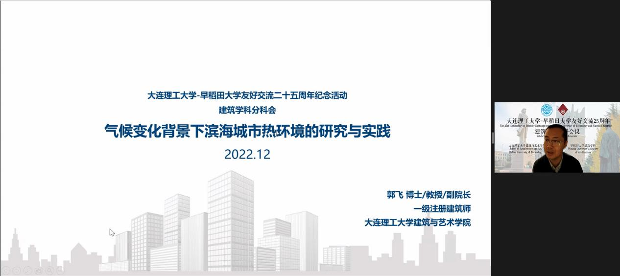 12月15日上午大连理工大学-早稻田大学友好交流25周年暨大连理工大学与日本高校合作周年云端纪念活动闭幕式于线上举行。作为两校系列学术活动,建筑学科学术论坛同期举办,两校共有百余名师生参会。会议由大连理工大学建筑与艺术学院苏媛副教授主持。大连理工大学建筑与艺术学院院长唐建教授与早稻田大学建筑研究所所长高口洋人教授致辞,并分别介绍了大连理工大学和早稻田大学建筑学科的建设情况。