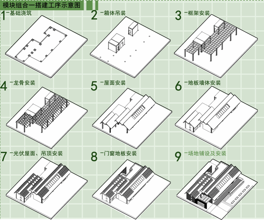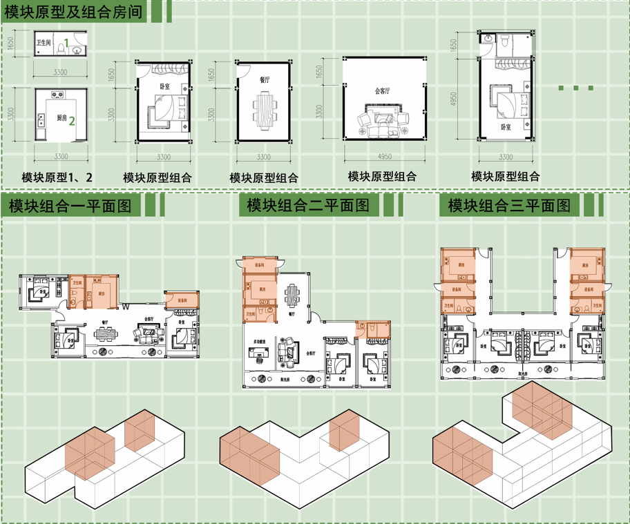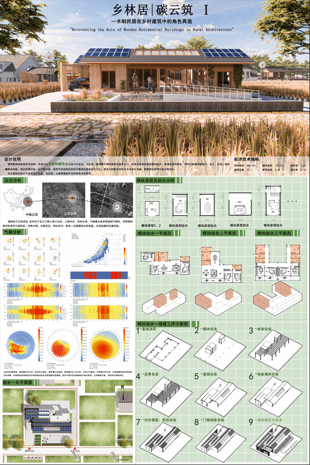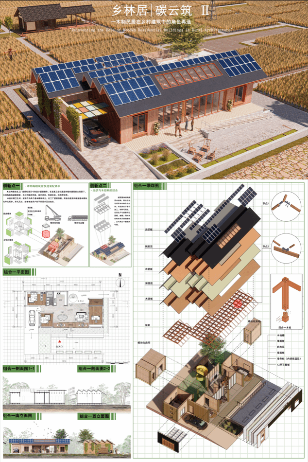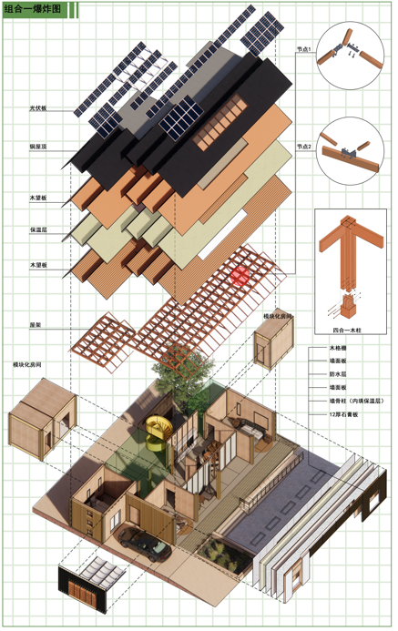 建筑整体结构采用木结构,本设计以木结构模块化为设计出发点,卫生间、厨房两个模块原型为基本尺寸,其他功能房间是原型的拓扑,既满足使用需求,同时又能够快速设计,加工、安装、维护、翻新和拆除,响应双碳目标。在节能方面,采用可活动阳光间和天窗通风被 动设计为主,屋顶太阳能光伏发电主动设计为辅,使建筑在能源方面自给自足。本次模块化设计不仅适用于民居,在民宿、公建等建筑中也同样具有拓展性。