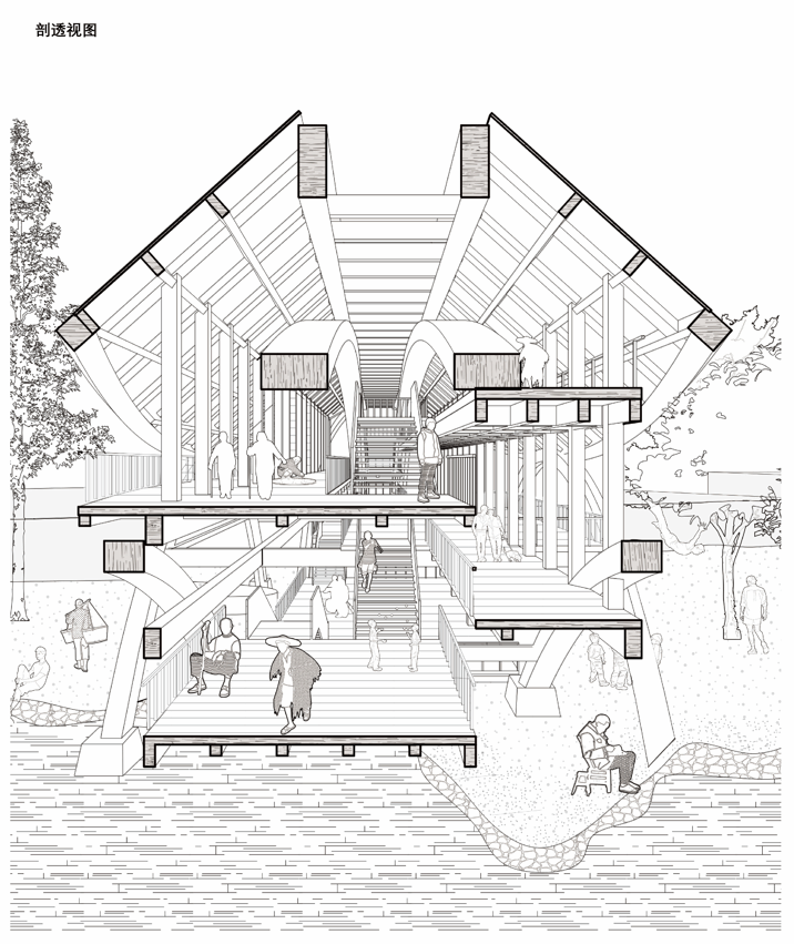 建筑场地原为一座历史悠久的廊桥,因不幸的火灾导致其被烧毁,本设计从再生的角度出发,致力于保留廊桥的传统韵味,同时通过创新的设计和材料运用,使其焕发新生。本设计旨在结合传统拼结构新型材料CLT,打造座具有乡村风情的木桥在传统建筑元素的基础上,引入现代设计理念,在拱形结构上运用CLT材料,使桥梁更适应现代社会的需求。提升结构的可持续性和强度。CLT不仅具备优异的力学性能,还具有环保和可再生的特点,符合现代建筑可持续发展的趋势。将桥打造成为乡村的城市客厅,为居民提供多层次的休闲和社交体验,通过引入河中土地和在顶层眺望的设计元素,使桥梁成为连接自然和社区的特殊场所,设计的过程中,强化桥梁的城市客厅功能,为居民提供交流和互动的平台,增强社区凝聚力。桥的底层设计允许居民进入河岸打造水景区域,为居民提供与自然亲近的空间桥的顶层提供开闻的视野,居民可以在这里欣赏河景,感受乡村的宁静美好,也可以远眺周围的风景,使其成为社区居民休闲娱乐的理想场所。