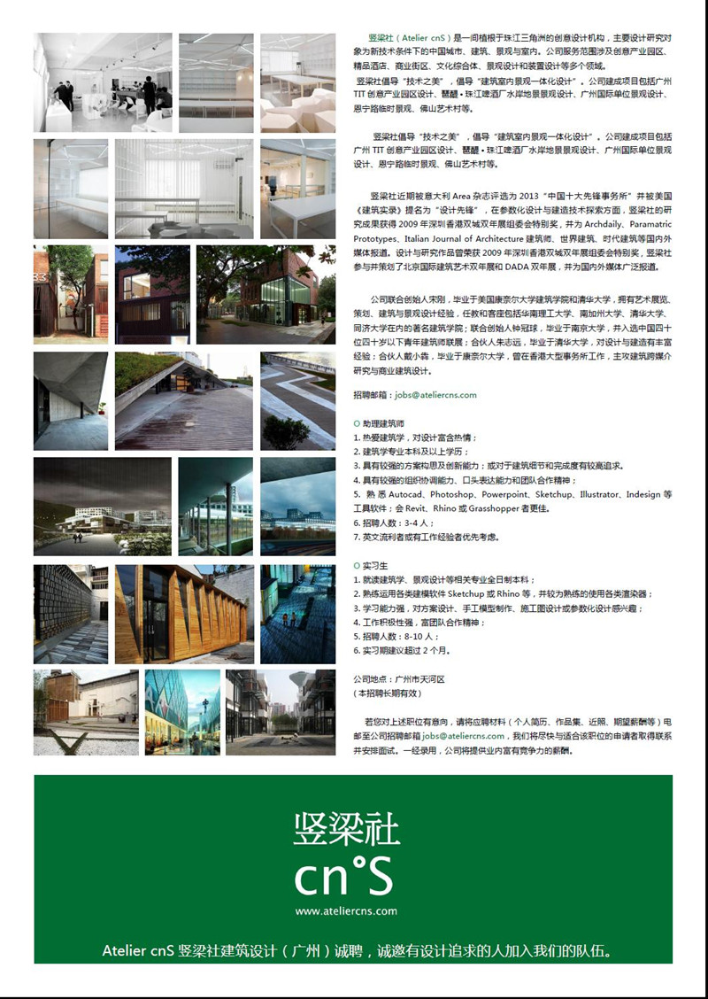 竖梁社(Atelier cnS)是一间植根于珠江三角洲的创意设计机构,主要设计研究对象为新技术条件下的中国城市、建筑、景观与室内。公司服务范围涉及创意产业园区、精品酒店、商业街区、文化综合体、景观设计和装置设计等多个领域。